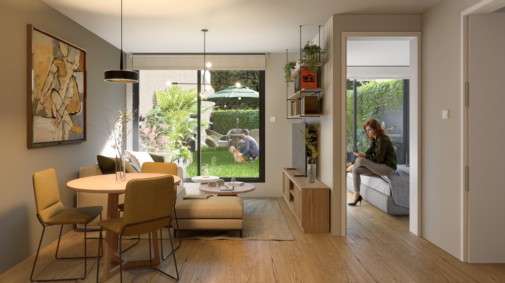 Apartamento de 1 dormitorio de 38m2 edificados más terraza de 3m2. Living-comedor con cocina integrada y baño. Pisos vinílicos símil madera, aberturas de aluminio y baño con piso de porcelanato. El edificio tiene rooftop con terraza pergolada, laundry y seguridad CCTV.