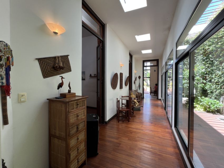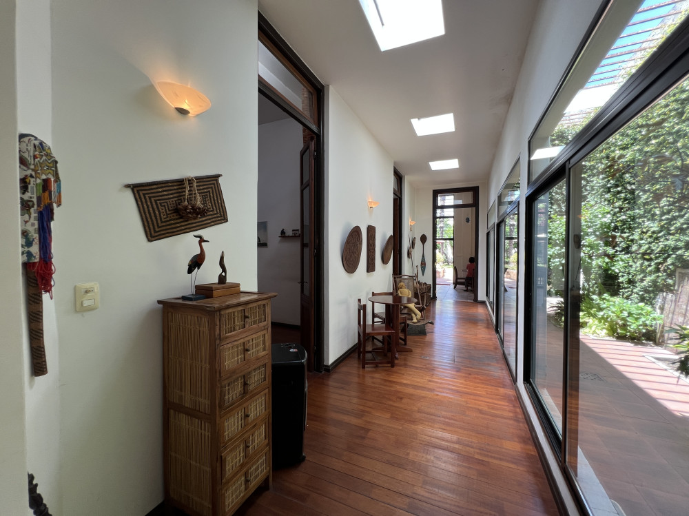 Al ingresar, una amplia recepción con ventanales al frente aporta calidez y carácter. Luego se integra un estar con claraboya, que brinda luz natural durante todo el día. Desde allí se accede a una galería que conecta con un hermoso patio interior, funcionando como un pulmón verde que ilumina y ventila los ambientes centrales.
